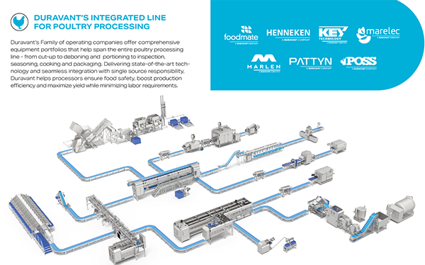 Duravant and its operating companies Foodmate, Henneken, Key Technology, Marelec, Marlen, POSS and Pattyn are exhibiting a broad portfolio of advanced processing and packaging solutions for poultry, meat and fish at IPPE, taking place Jan. 27–29 in Atlanta. The equipment on display in booth C43169 includes integrated lines and standalone systems spanning the entire protein processing operation. With best-in-class customer support and lifecycle services, Duravant delivers solutions that help ensure food safety, protect product quality, reduce labor and improve production efficiencies.